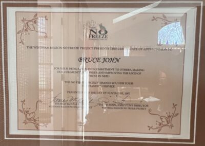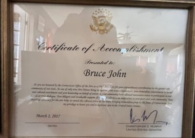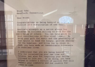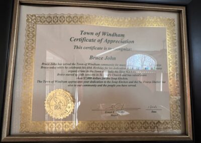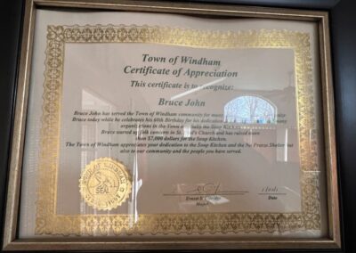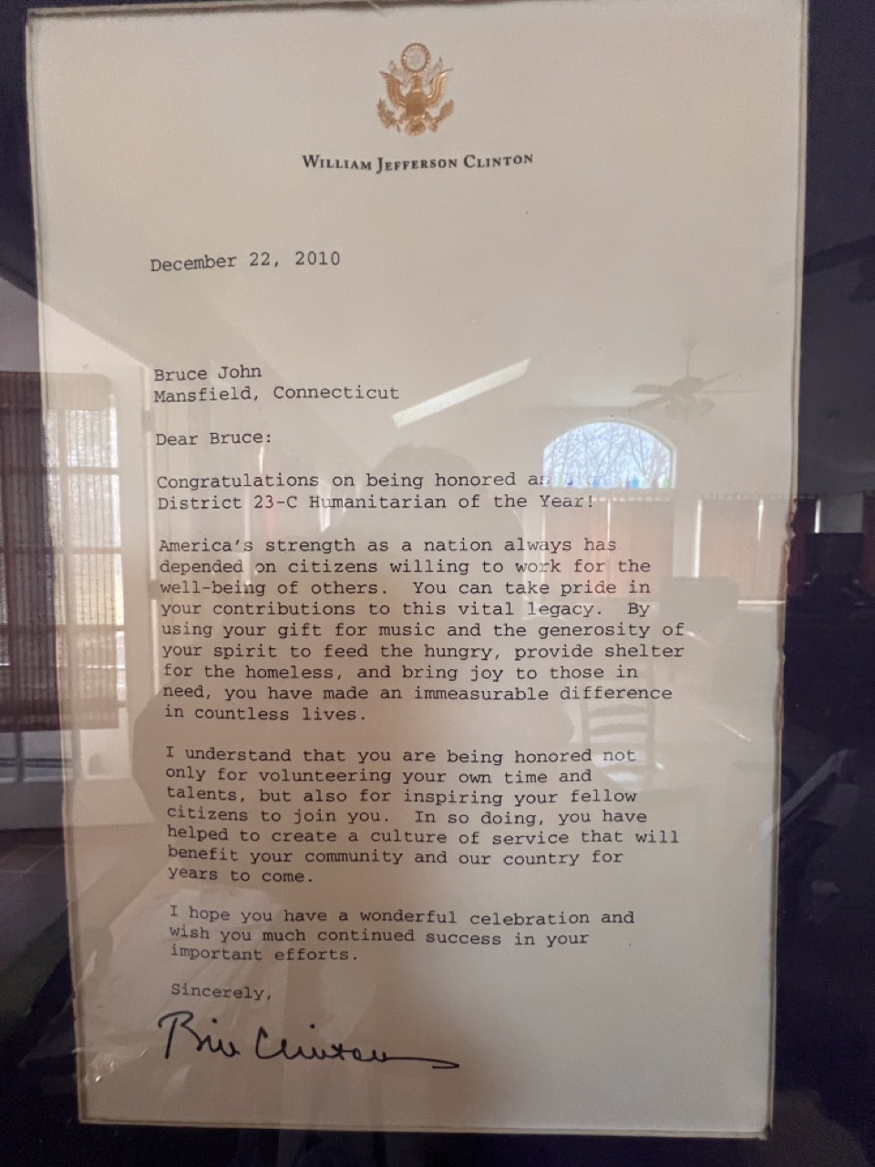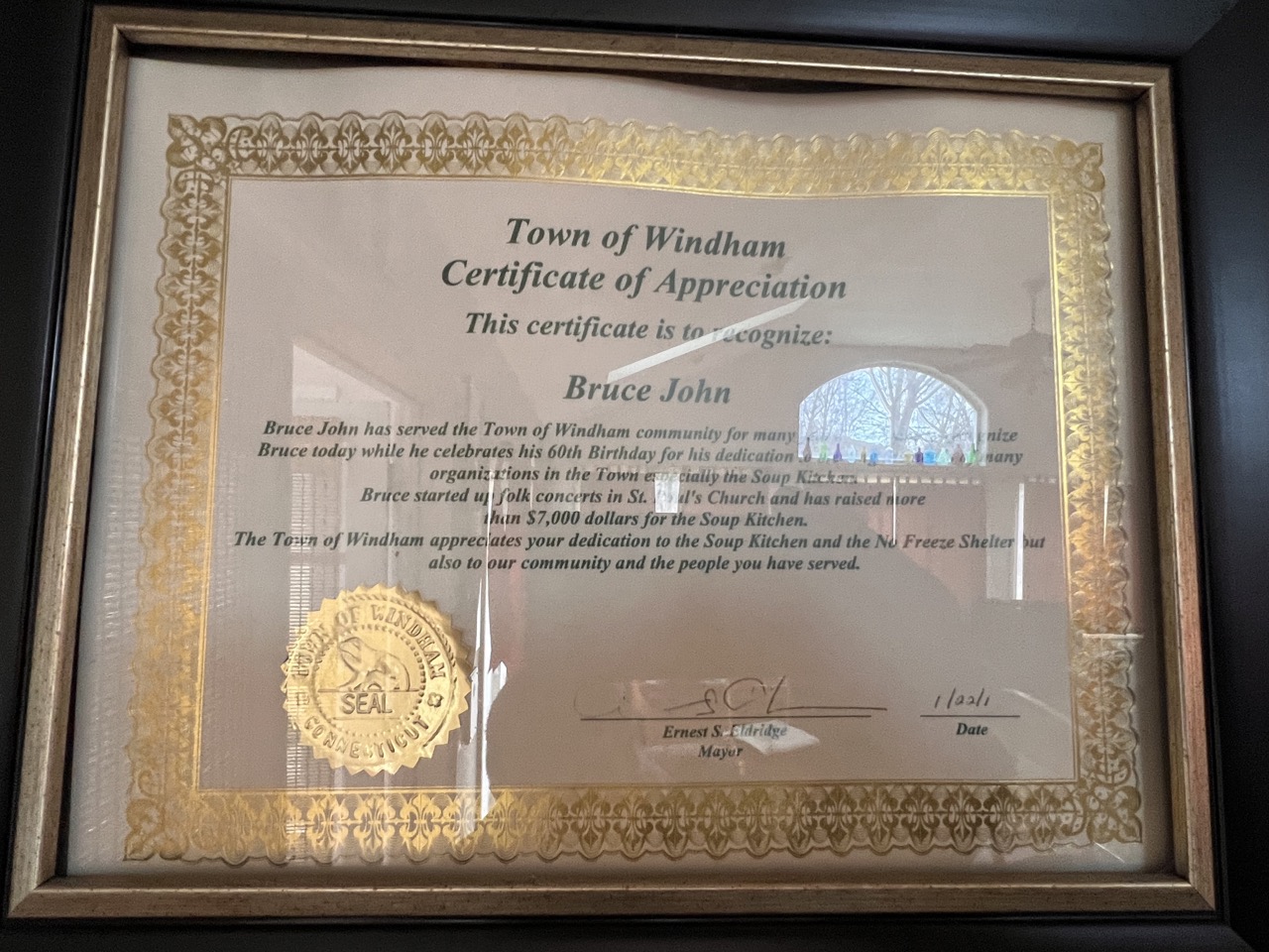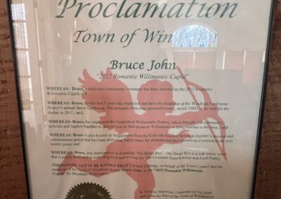 Bruce uses his past skills at booking great national entertainment to bring touring folk acts and past shaboo legends to perform to benefit the covenant soup kitchen. they have raised over $266,000 dollars so far. He also has done a major benefit dance for the past sixteen years with his band, the Dinosaurs After Dark (D.A.D.), to pay the $12,000 rent for the No Freeze homeless shelter in Willimantic. He willingly donates his music to many other area charities such as the American Cancer Society, Windham Area Interfaith Ministry, Windham Aids Program, Chocolate Festival, Eastern Ct. RailRoad Museum etc. or anyone else who needs his help at the time. Today you can catch Bruce performing live music at many area restaurants and venues as well as helping his community in many other ways.