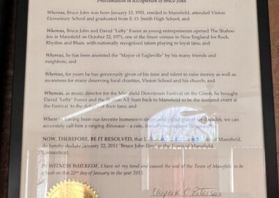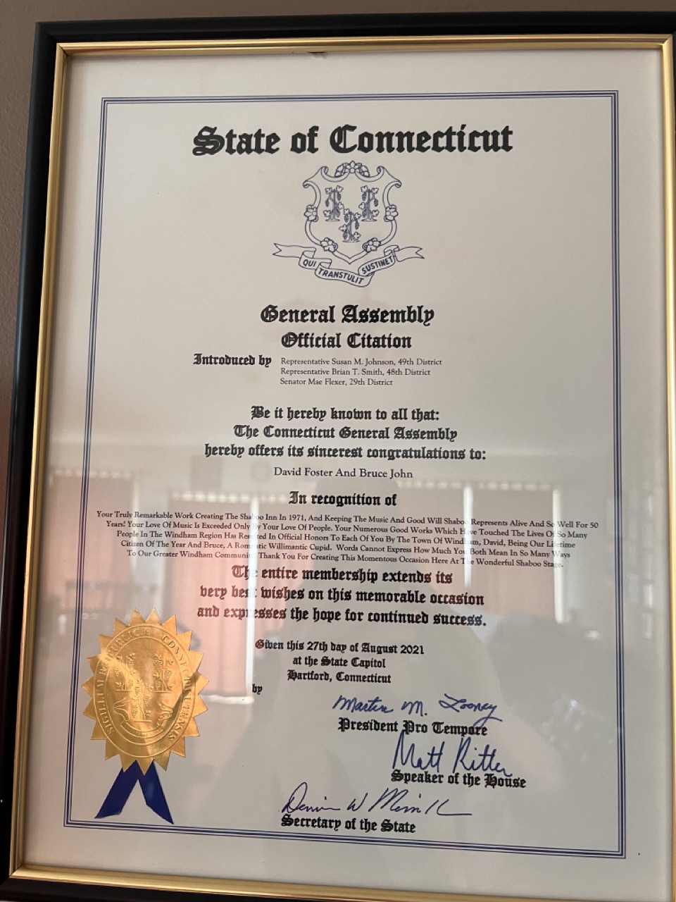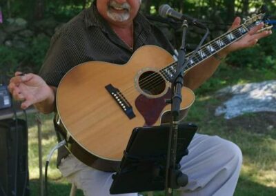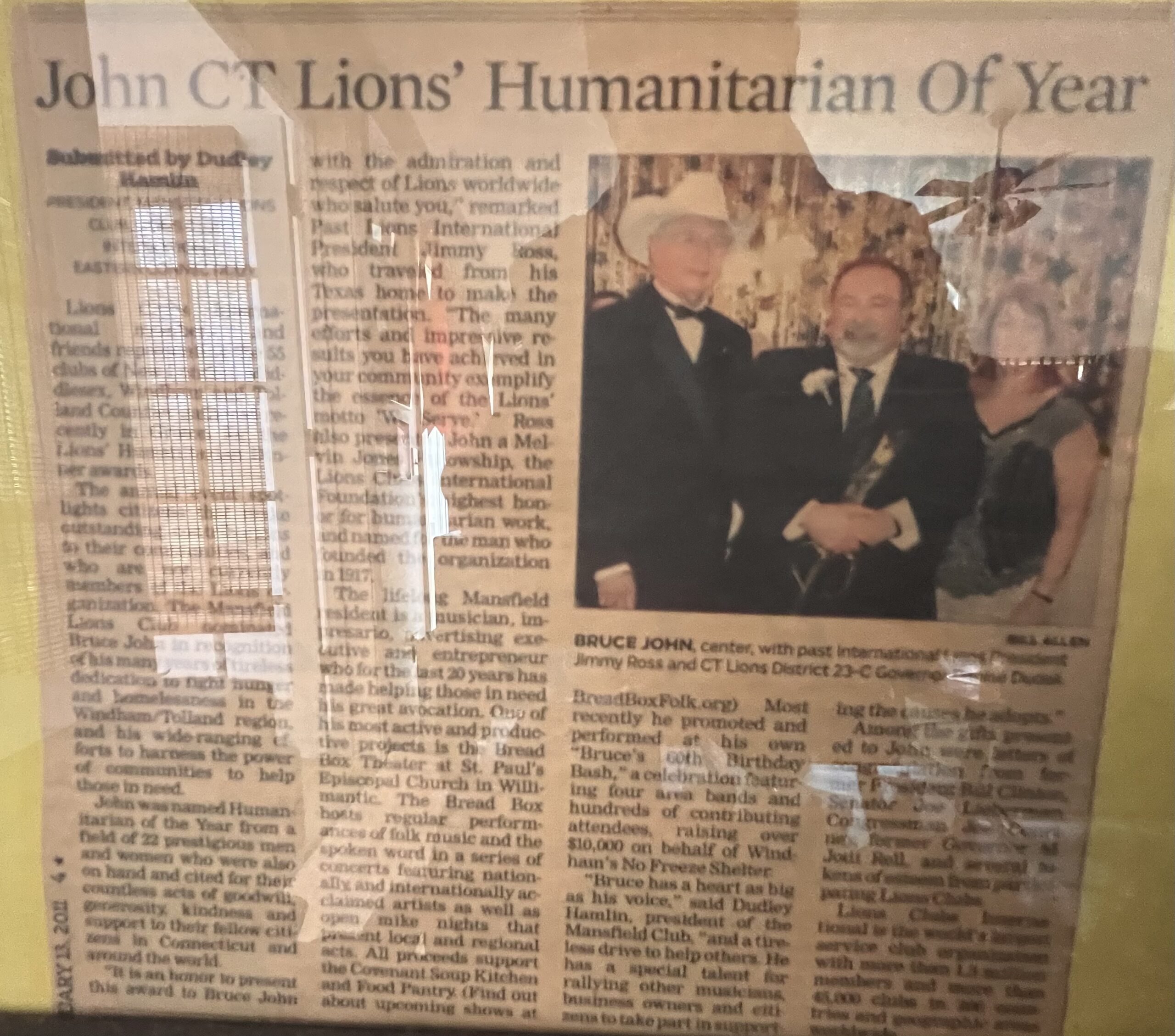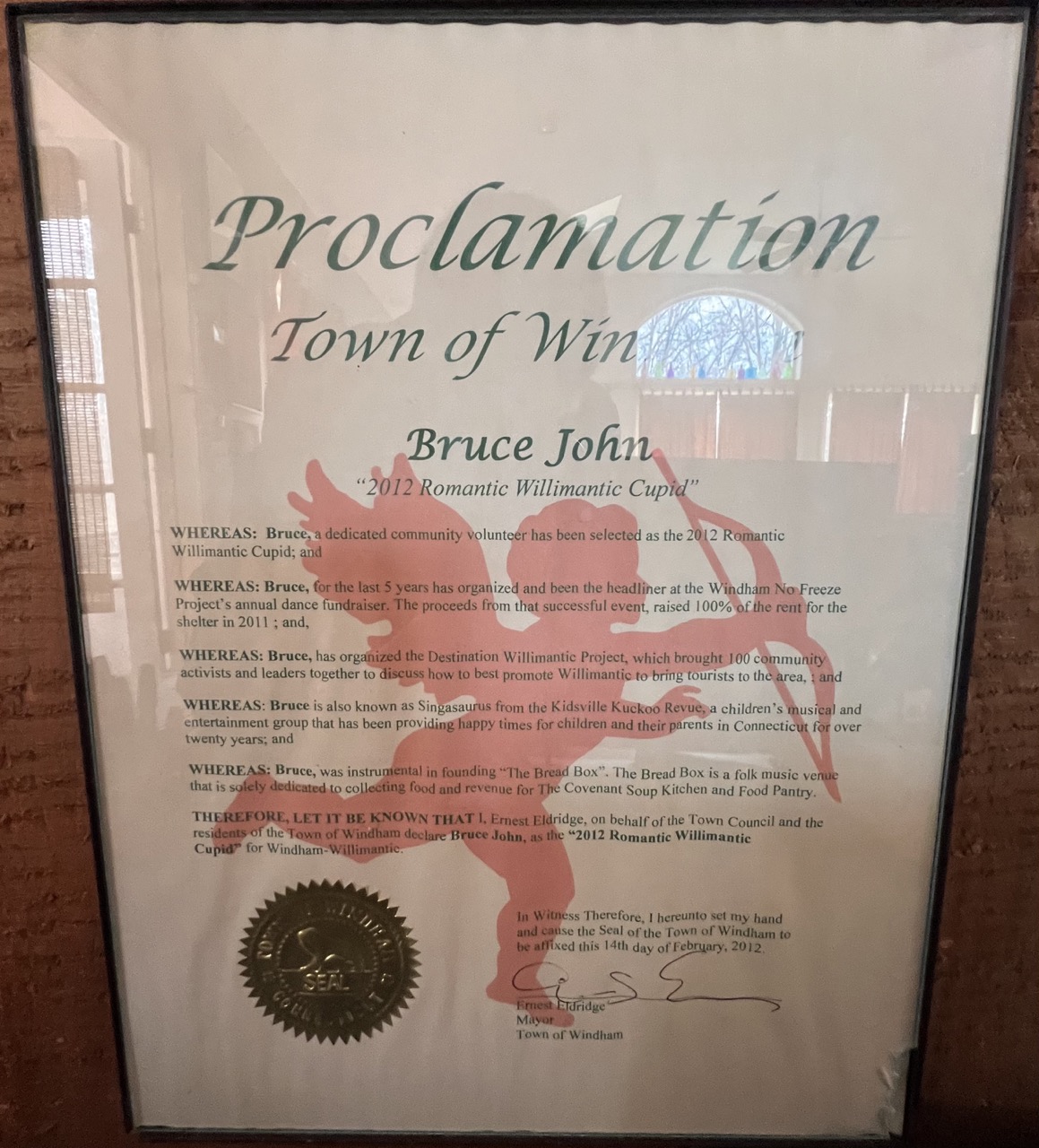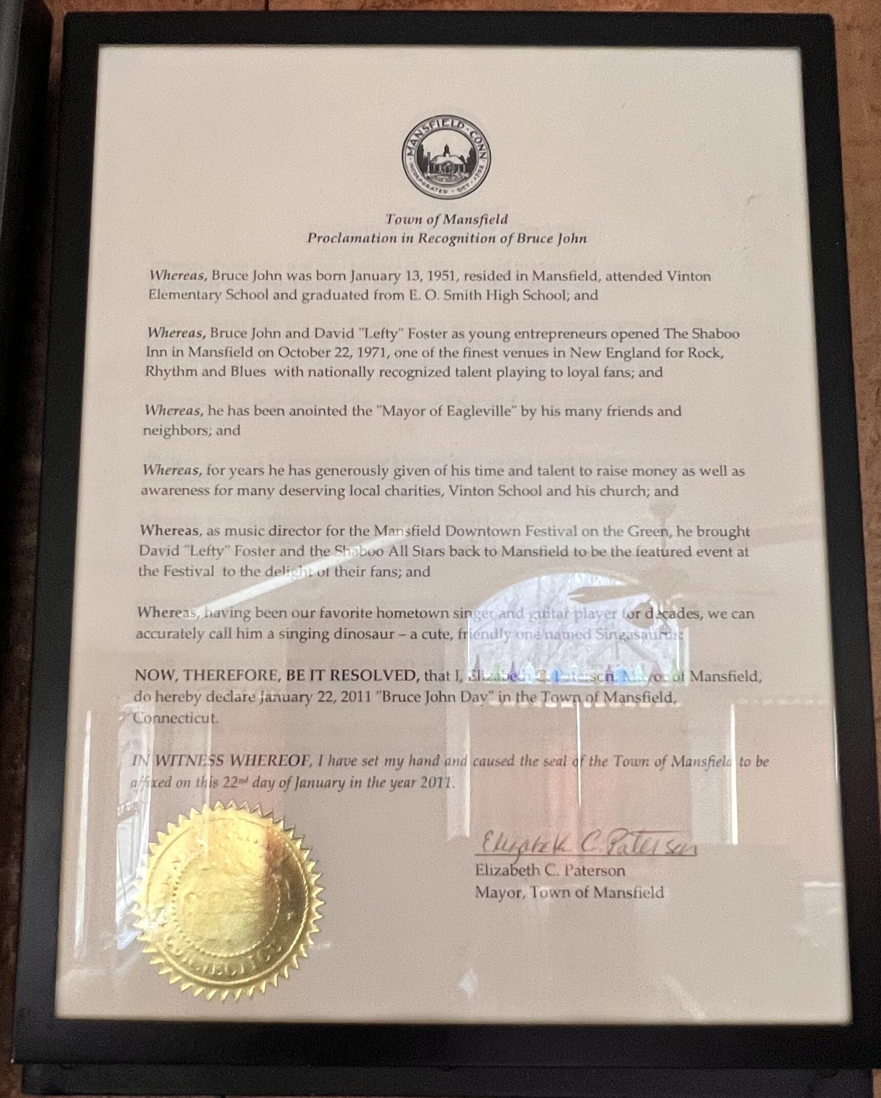 Bruce John, grew up in the beautiful downtown Eagleville section of Storrs connecticut and has lived there for more than 70 years. He started performing at coffee houses and hootenannies in 1962 and has continued to play guitar & sing professionally for his entire life. He is well known in the area as the Singasaurus from the Kidsville Kuckoo Revue, a band geared towards entertaining families and young children, that he founded in 1989. And as The Human Juke Box who knows over 400 songs. Bruce was co-founder and owner of the iconic Shaboo Inn, a popular Willimantic nightclub in the seventies. The club brought in every famous band you can imagine from around the world, right here to Mansfield/willimantic.
