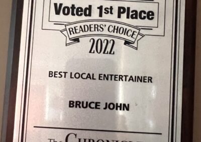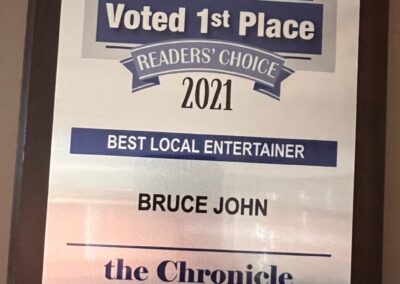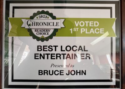 Bruce John’s show is an eclectic mix of Hit Songs, mostly from the 50’s, 60’s and 70’s. Classics like; King of the Road, Mr.Bojangles, Country Roads, Ring of Fire, Dock of the Bay, All I have to do is Dream, The Boxer, Sweet Caroline, Will you Still Love Me Tomorrow and Hallelujah to name just a few. He has learned over the years to play the right songs for the audience in front of him. His performance will take you down a Musical Memory Lane of days gone by. He tries never to play too loud and is adaptable to any party or dining situation, be it a living room, an auditorium, a campground ,a patio or a fine dining restaurant. The biggest testament to his ability to please an audience is the number of restaurants and private functions that he has been invited back to play at for many years.